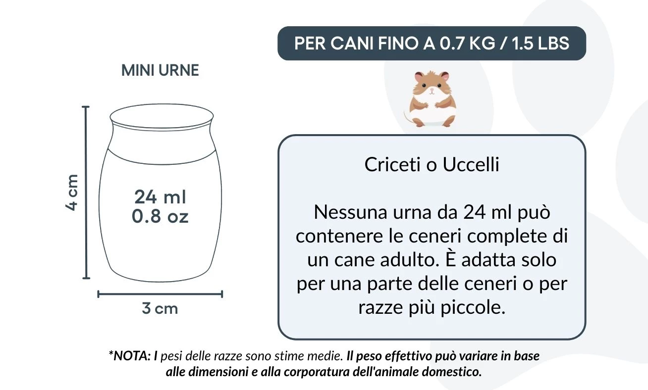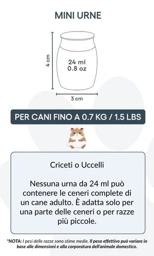 Taille / Capacité de l’urne : 3 cm (L) × 4 cm (H) × 3 cm (P) | 24 ml Profondeur : 25 mm | Diamètre du couvercle : 25 mm | Diamètre de la base : 22 mm Convient pour : hamsters, petits oiseaux, ou une partie des cendres d’un chien de plus grande taille