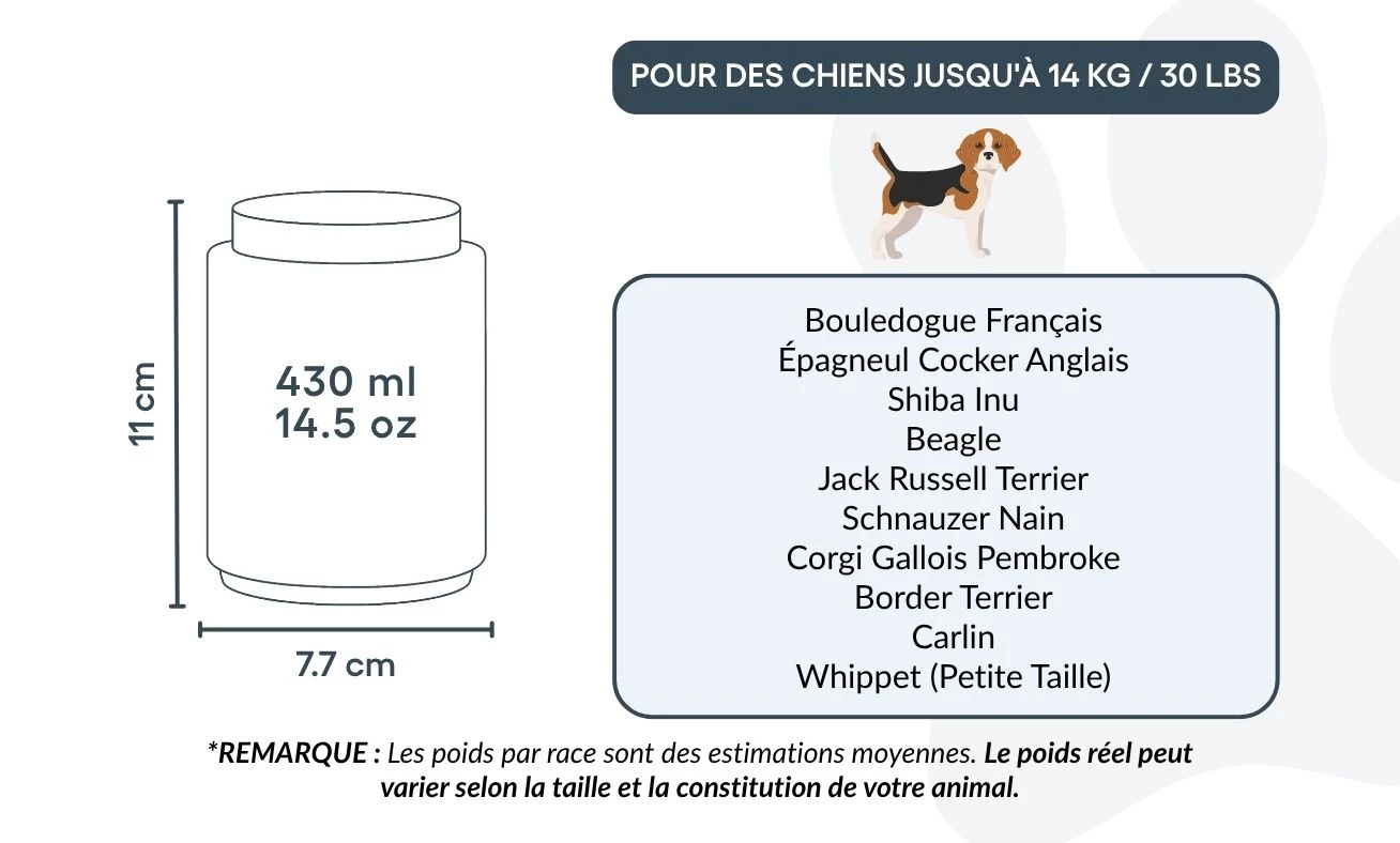 Remarque : les poids des races sont des estimations moyennes et peuvent varier selon la taille et la morphologie de votre animal.