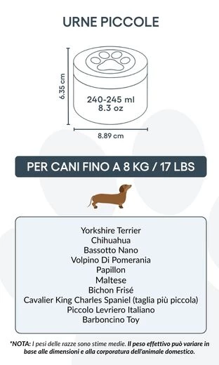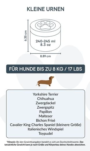 Cette urne pour chien est idéale pour les animaux jusqu’à 8 kg, mais peut aussi convenir à ceux qui souhaitent préserver une partie symbolique des cendres d’un chien plus grand — pour partager le souvenir entre proches ou créer plusieurs souvenirs commémoratifs. Elle permet de garder une part de votre compagnon tout près de vous, de la manière la plus juste pour vous.