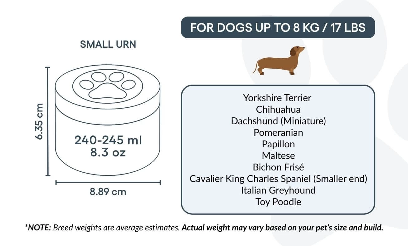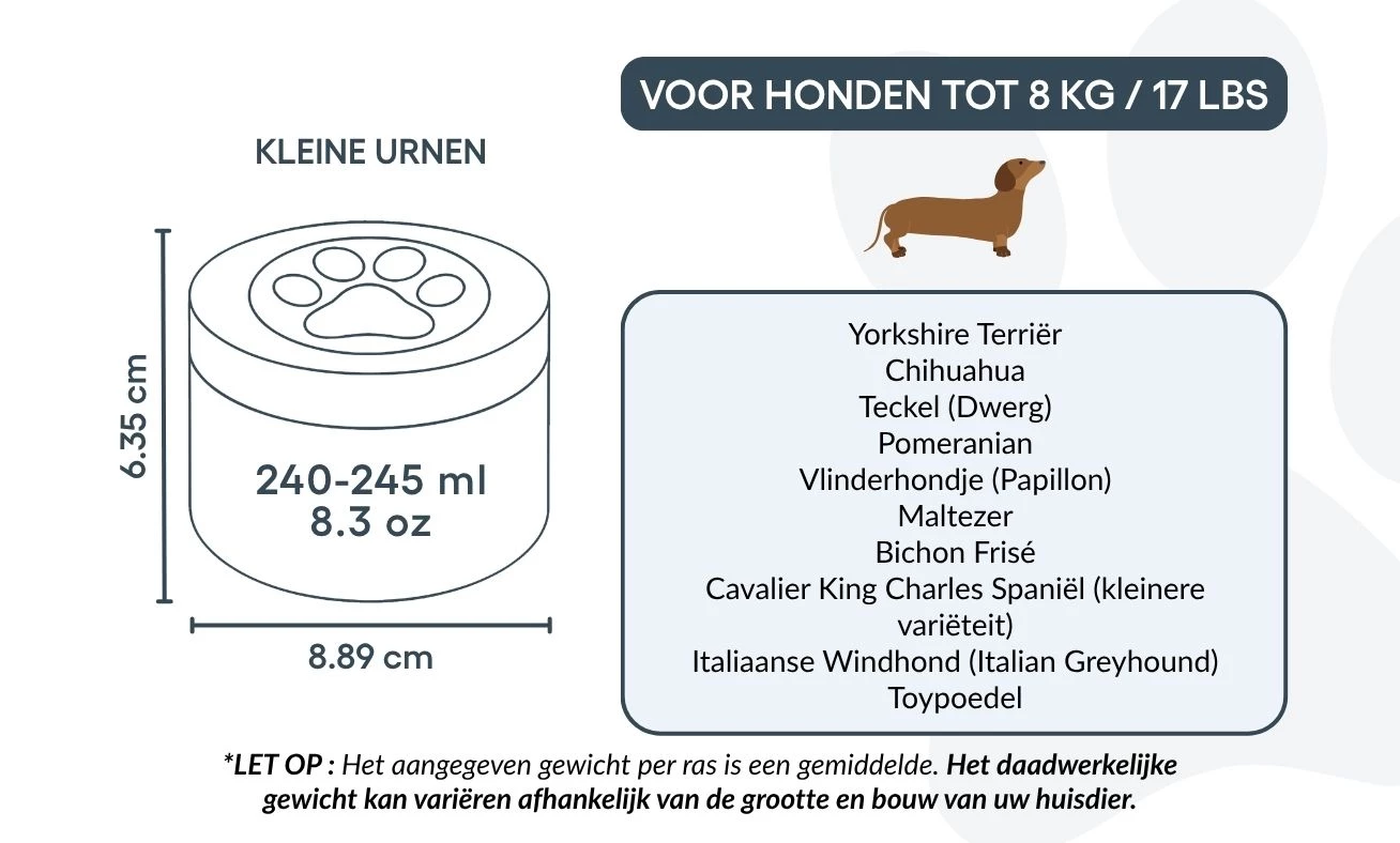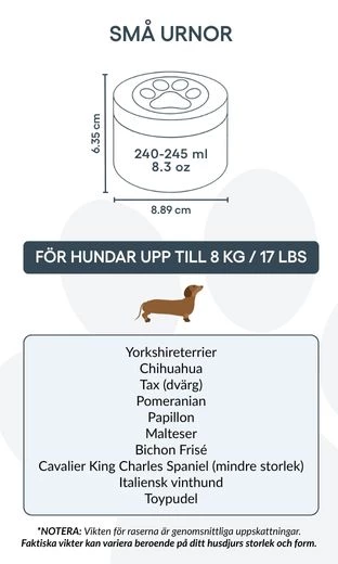 Cette urne commémorative convient parfaitement aux chiens jusqu’à 8 kg, mais peut également être utilisée pour préserver une partie symbolique des cendres d’un animal plus grand — pour partager le souvenir avec vos proches ou créer plusieurs souvenirs personnalisés. Elle permet ainsi de garder une part de votre compagnon tout près de vous, de manière intime et respectueuse.