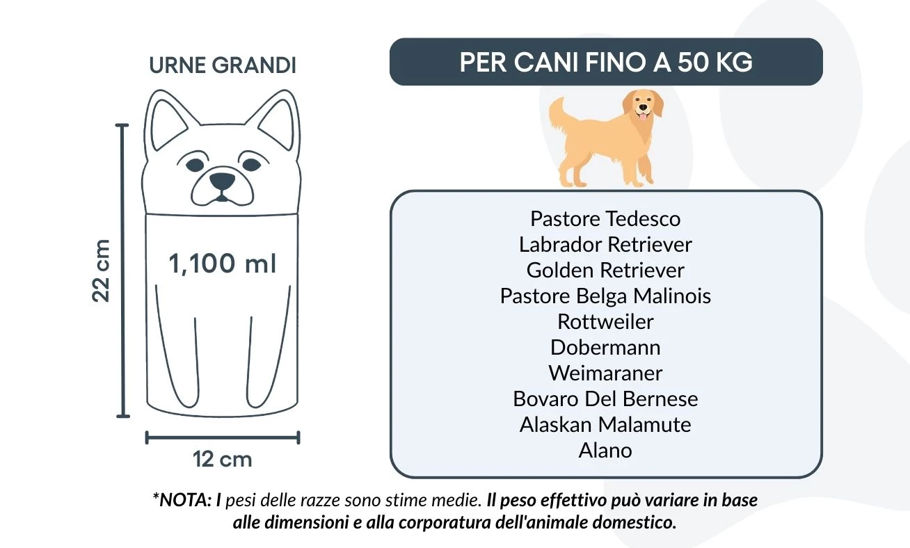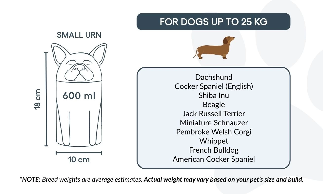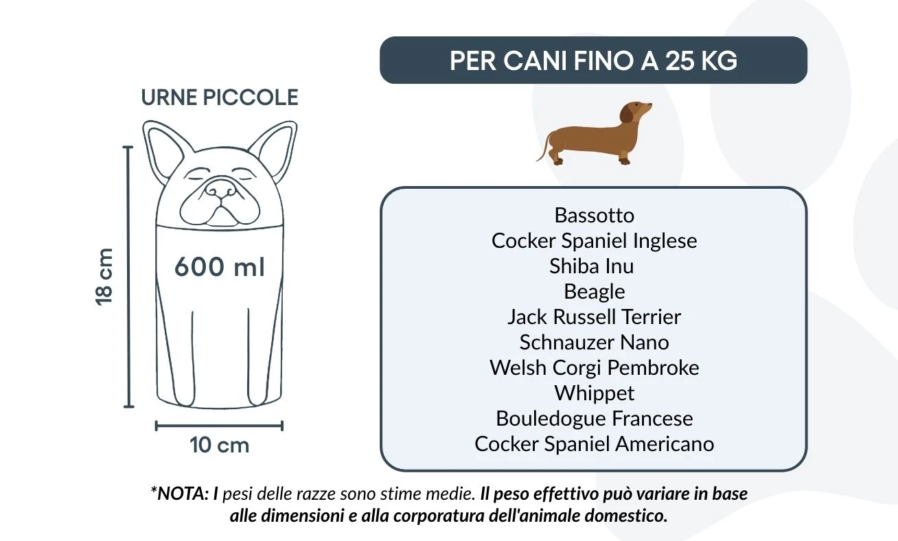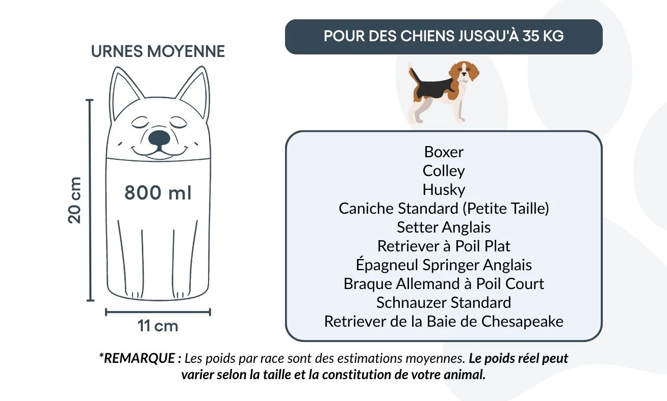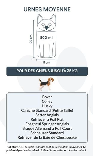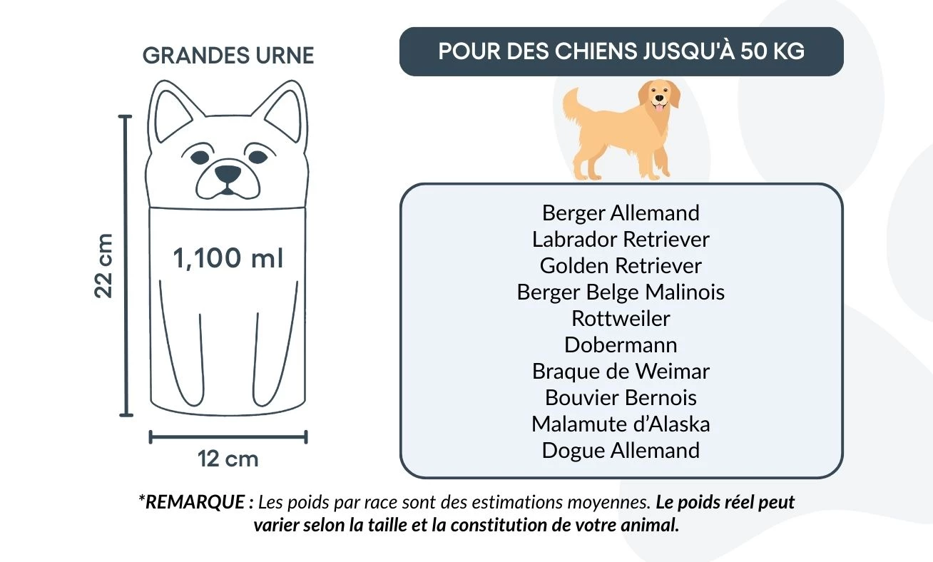Remarque : les volumes indiqués sont des estimations moyennes basées sur le poids après crémation. Veuillez prendre en compte le poids et la morphologie de votre animal avant de choisir la taille.