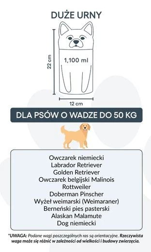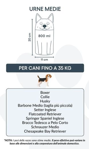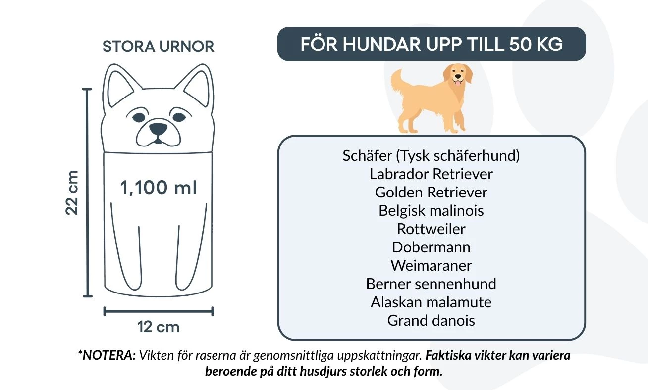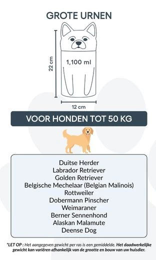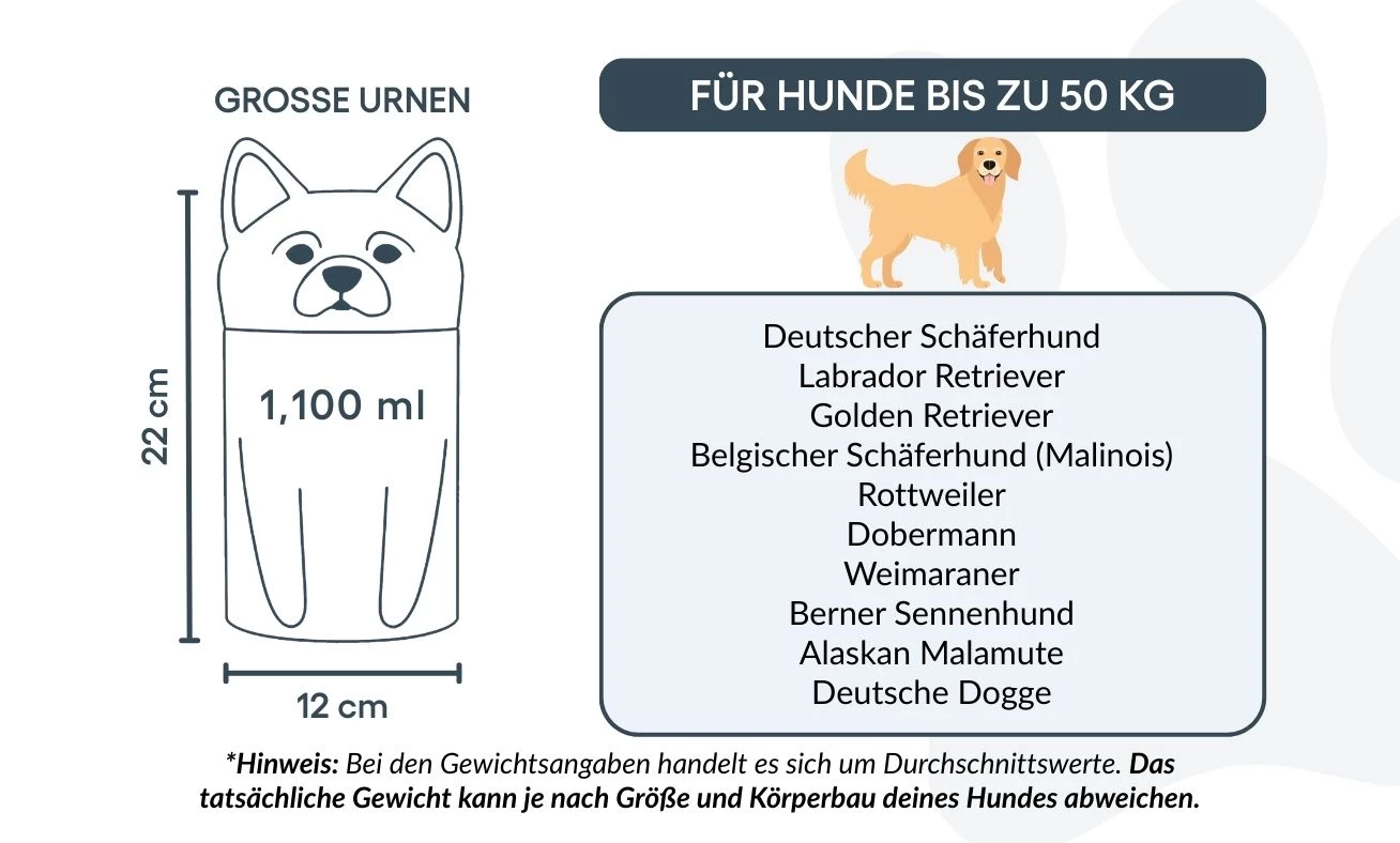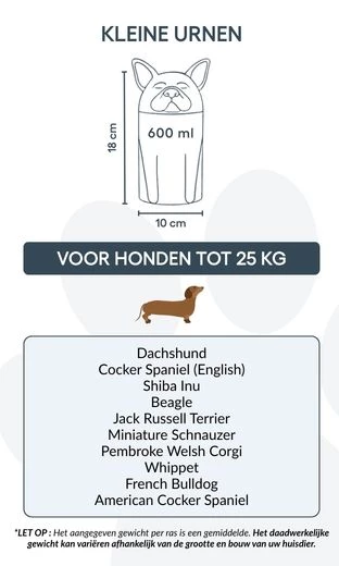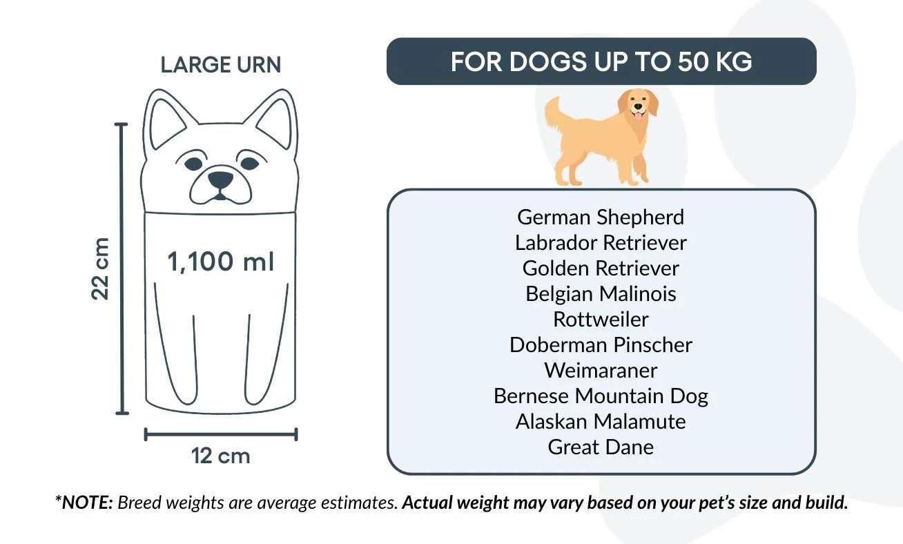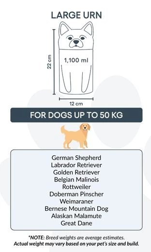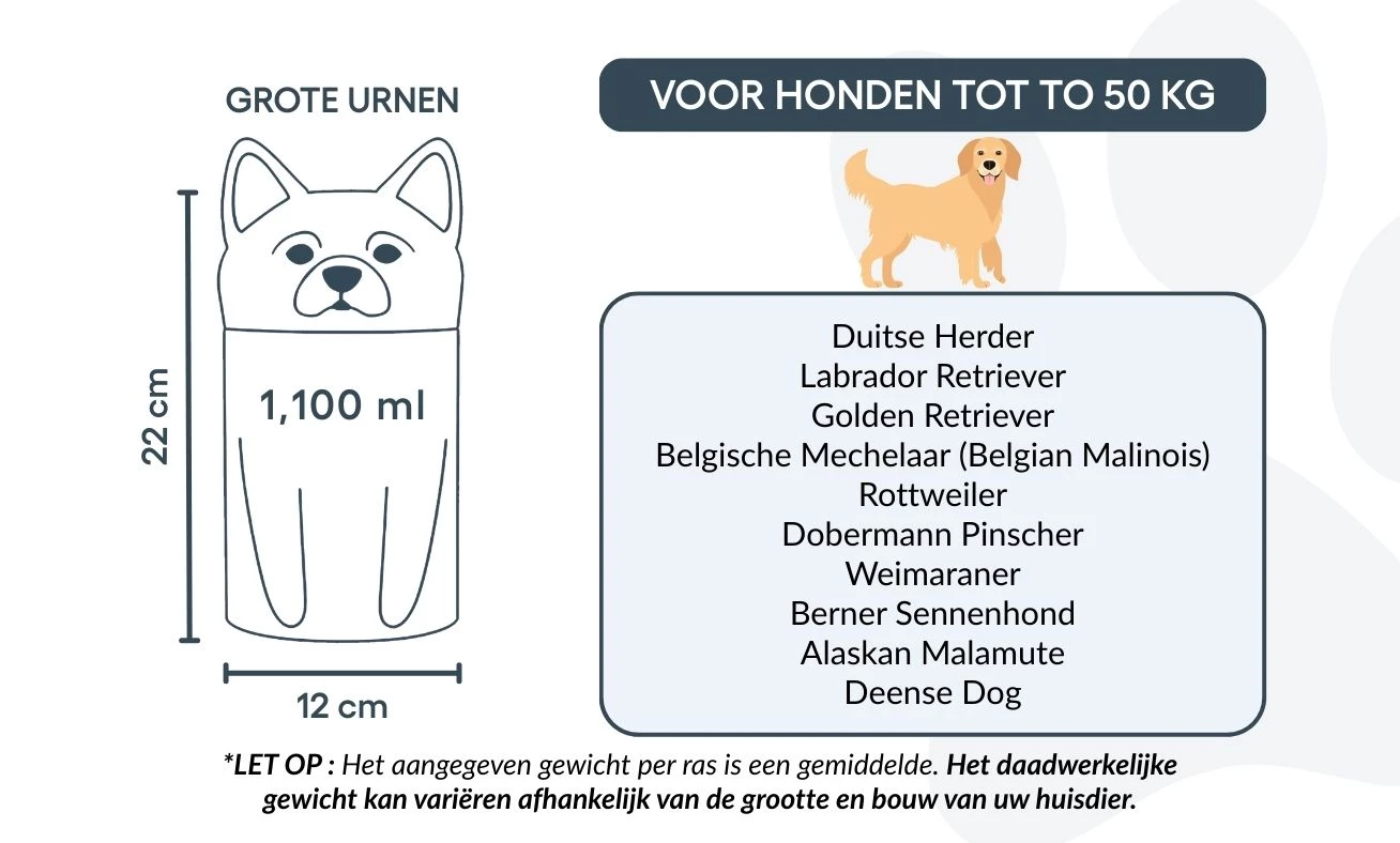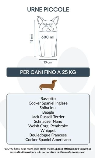 Remarque : les volumes indiqués sont des estimations moyennes basées sur le poids après crémation. Veuillez prendre en compte le poids et la morphologie de votre animal avant de choisir la taille.