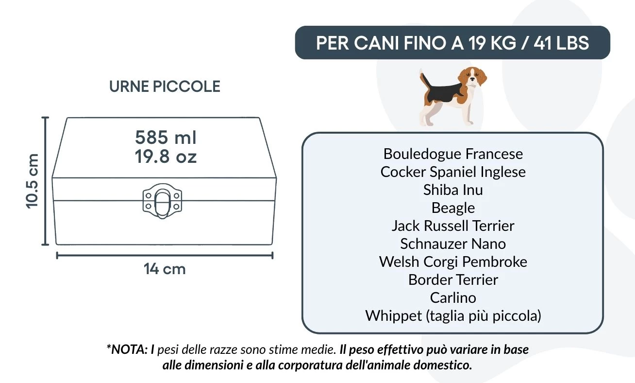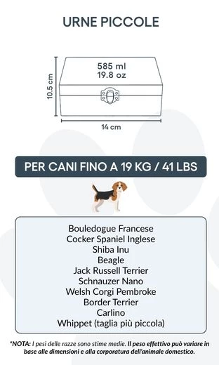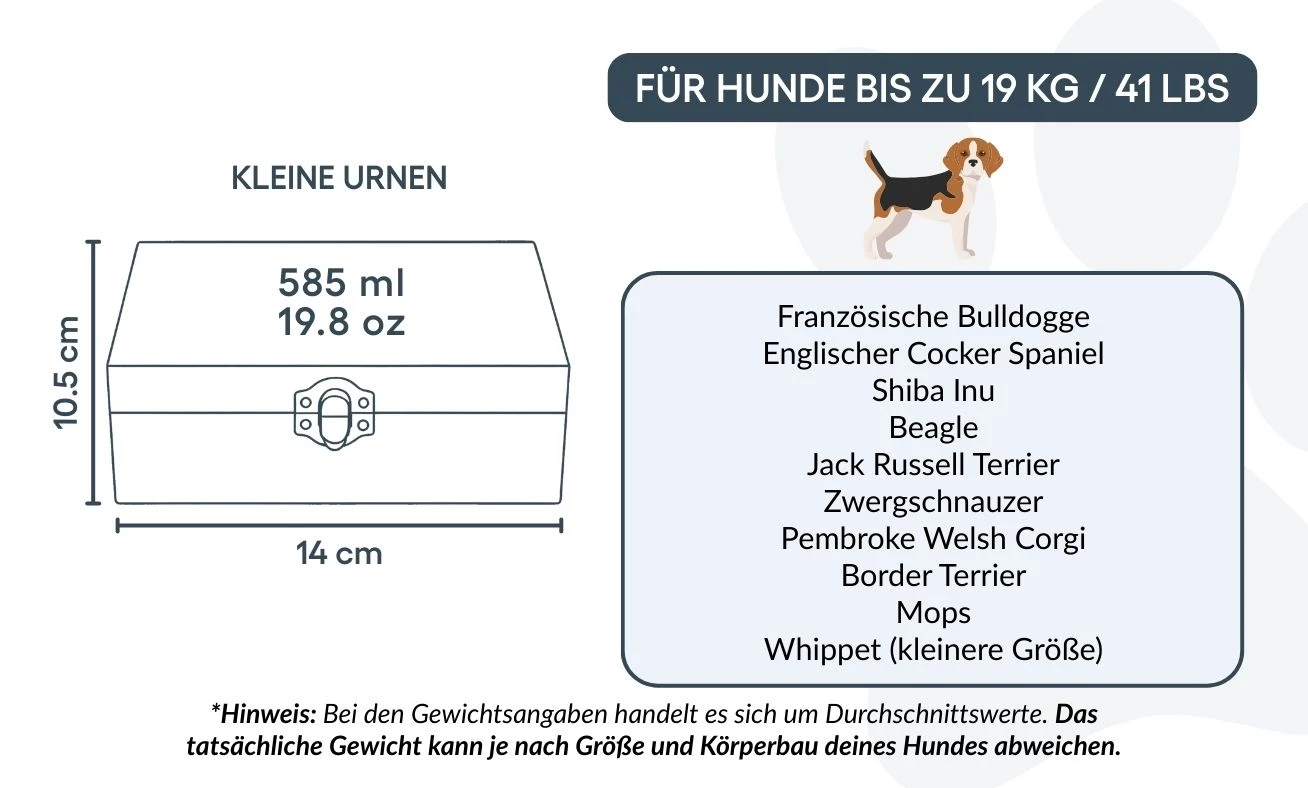 Convient pour les chiens jusqu’à 19 kg / 41 lb, ou pour une partie des cendres d’un chien plus grand.