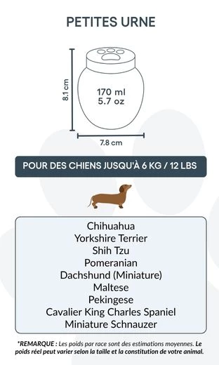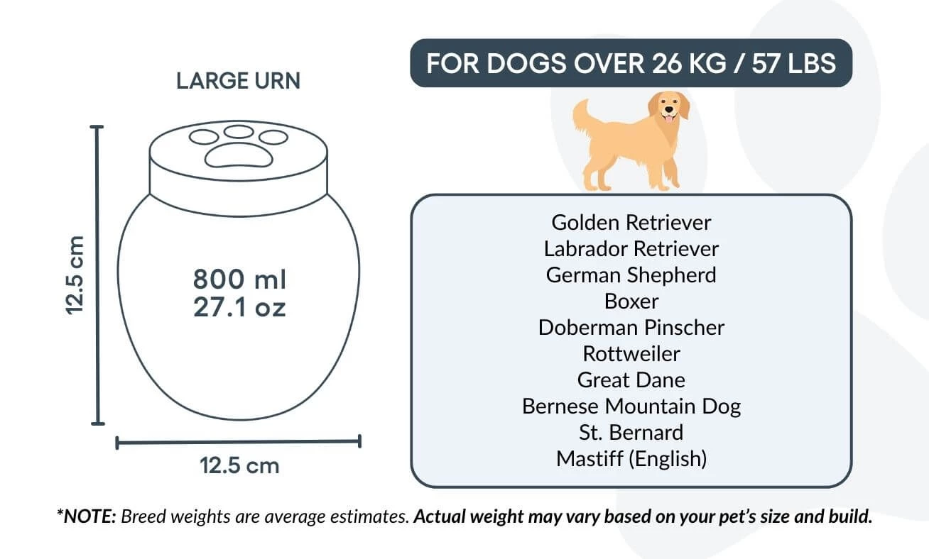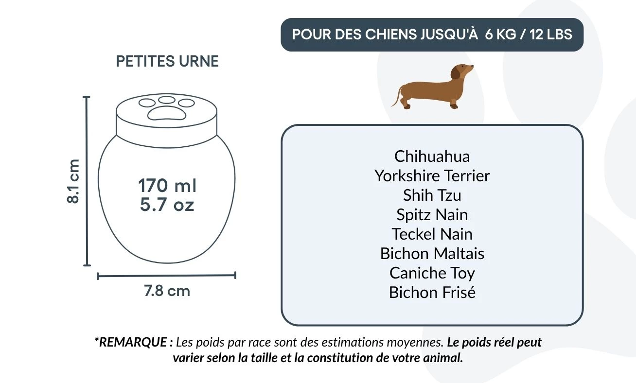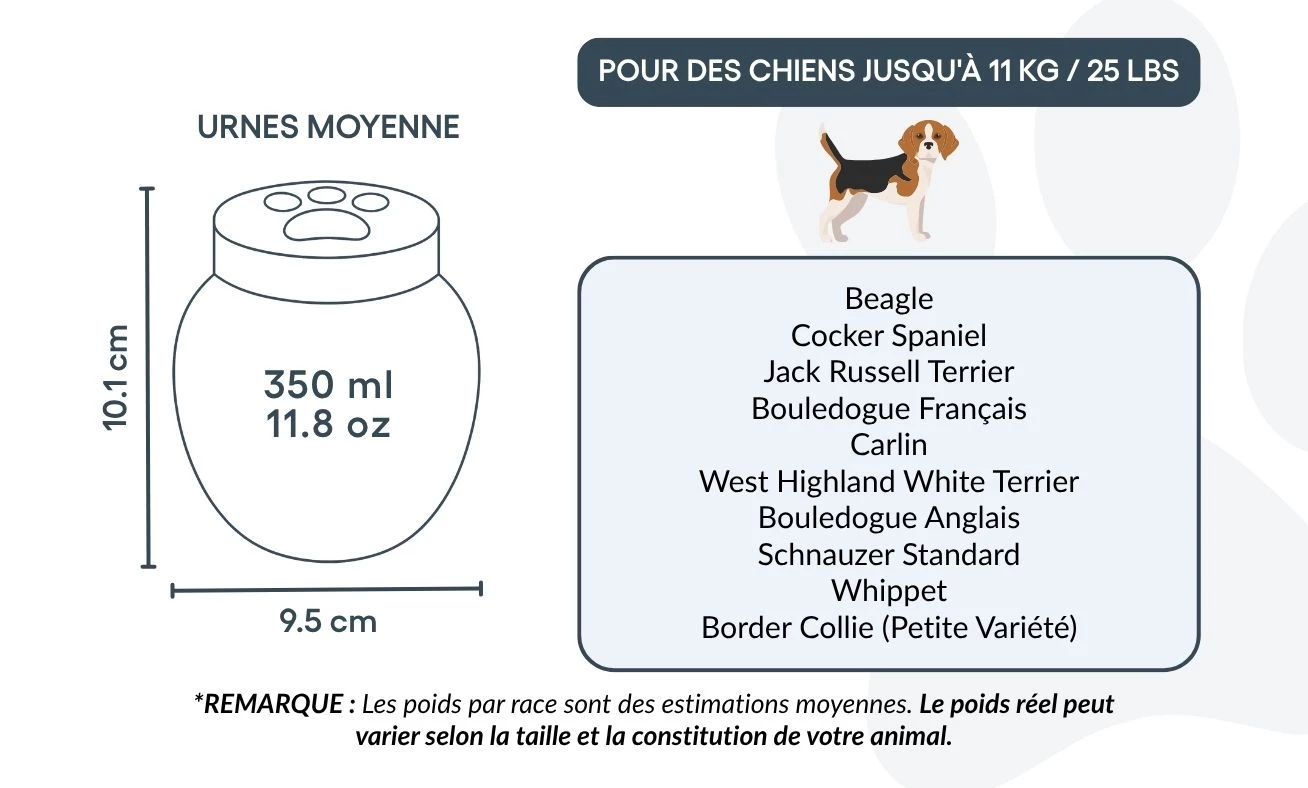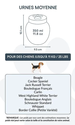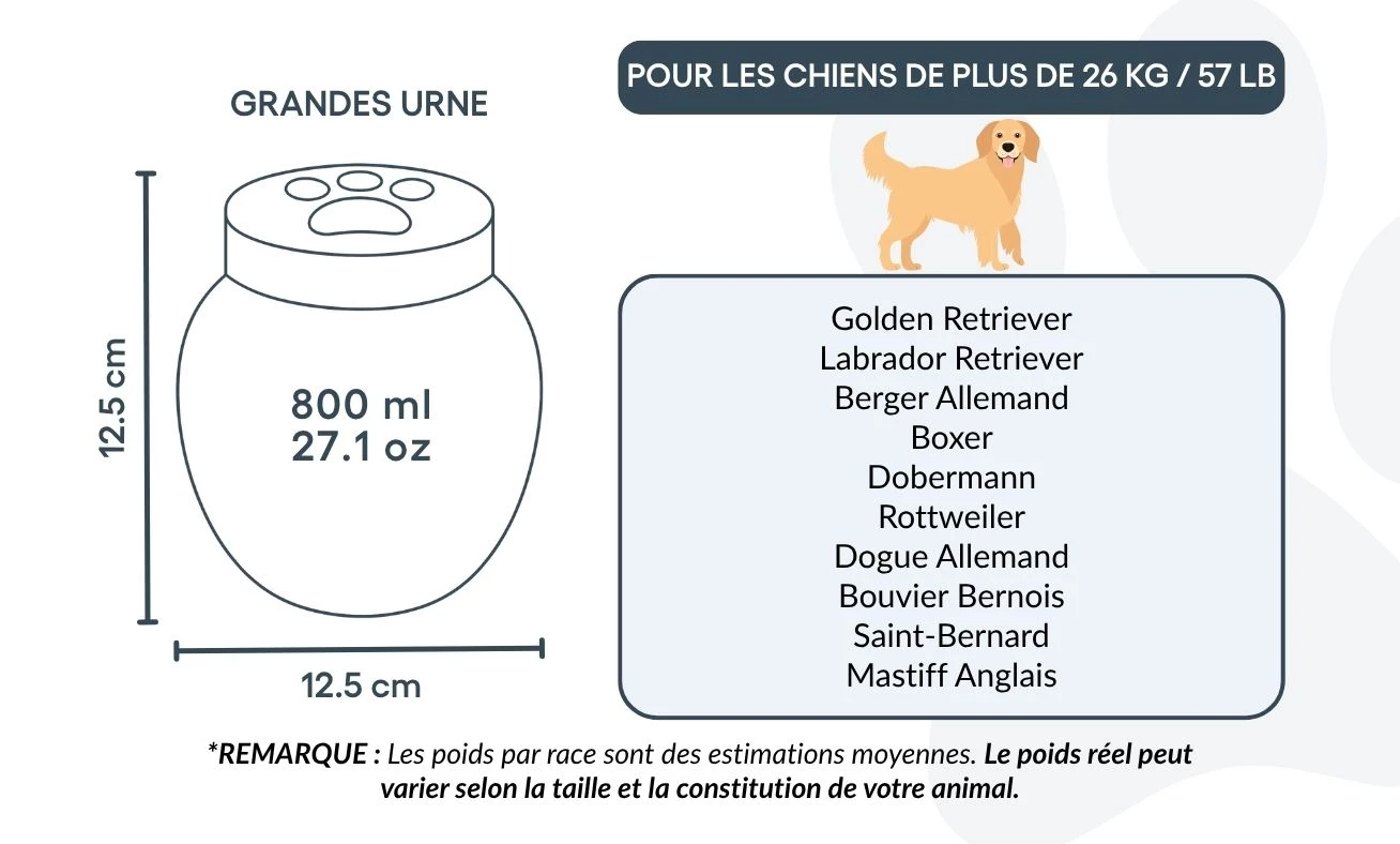 Dire adieu à un compagnon bien-aimé n’est jamais facile. Nos urnes funéraires personnalisées pour chiens sont conçues pour offrir paix et réconfort, en vous permettant de préserver sa mémoire avec dignité. Fabriquée en céramique résistante, chaque urne est soigneusement personnalisée et disponible en trois tailles pour convenir aux chiens de toutes races et morphologies.